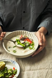 Low in carbohydrates and high in protein to support a drip-feed of energy to minimize snacking, this delicious, healthy soup can be eaten on its own or with the addition of courgetti or some cooked prawns. The chicken is also a great source of B vitamins for energy, and coconut milk provides caprylic acid, known for its anti-microbial effect in the gut. This recipe is also warming for a cold, wintry day, although in Thailand it would be eaten on a hot day too!
